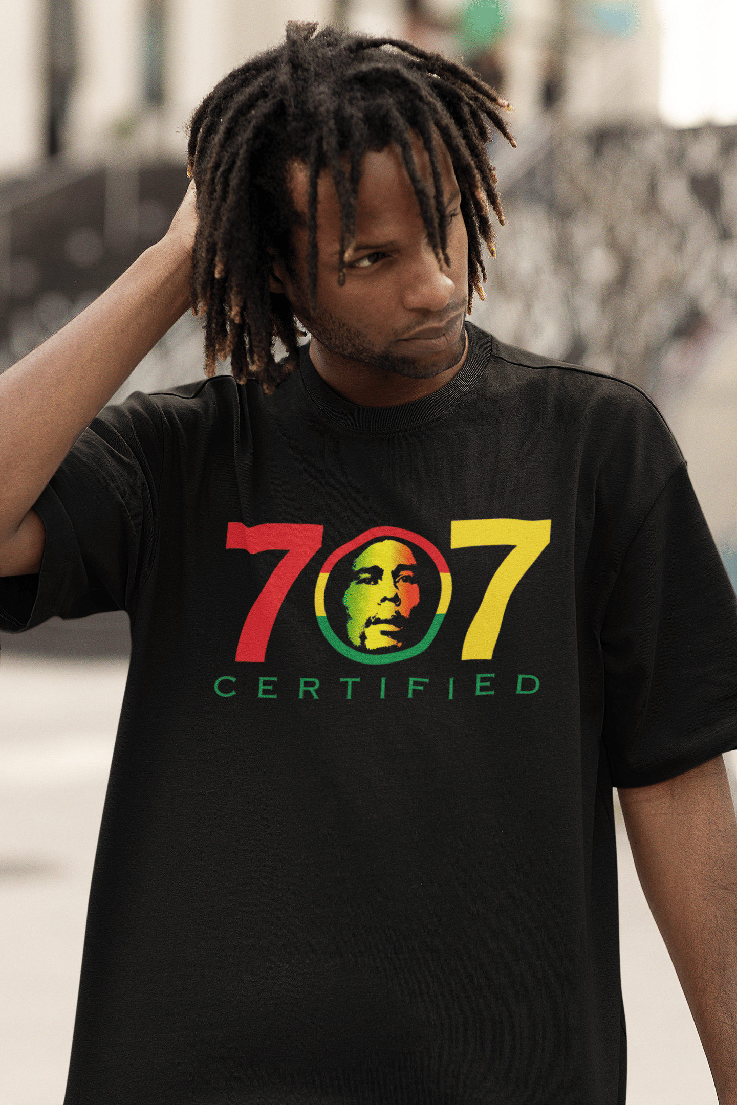 "Embrace the spirit of Bob Marley with our exclusive 707 Certified design, featuring classic Rasta colors of red, green, and yellow. The sleek black T-shirt is crafted from 100% pre-shrunk cotton, ensuring both style and comfort. Celebrate the man, the music, the message, and the legend with this iconic piece